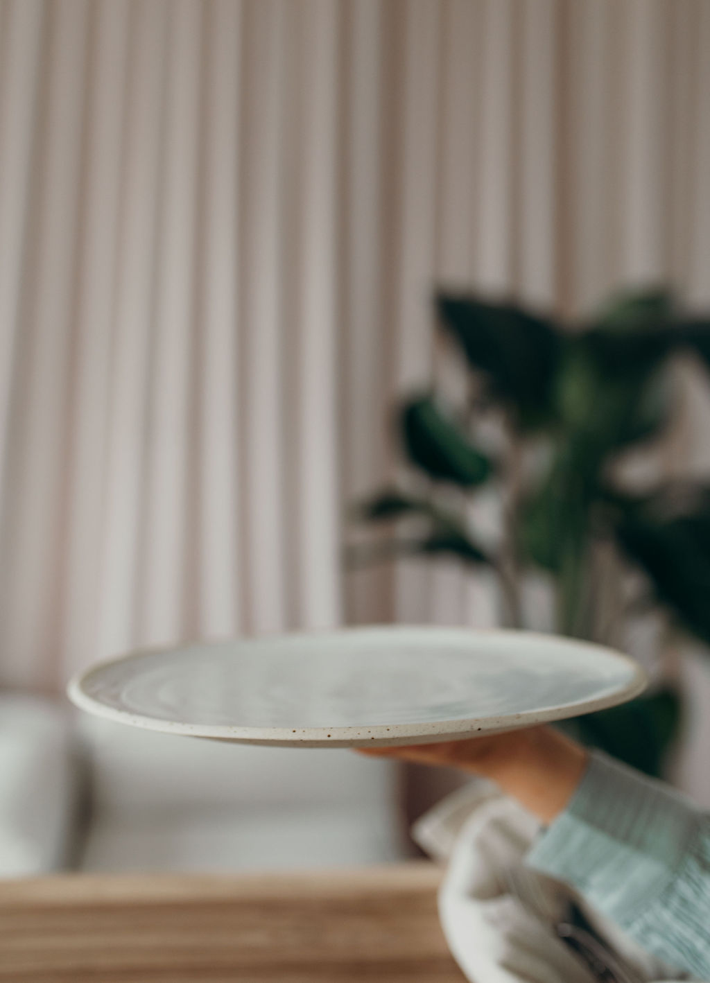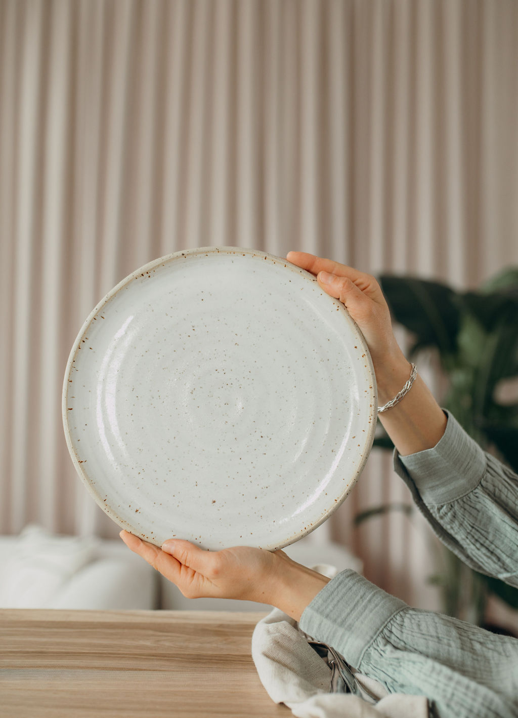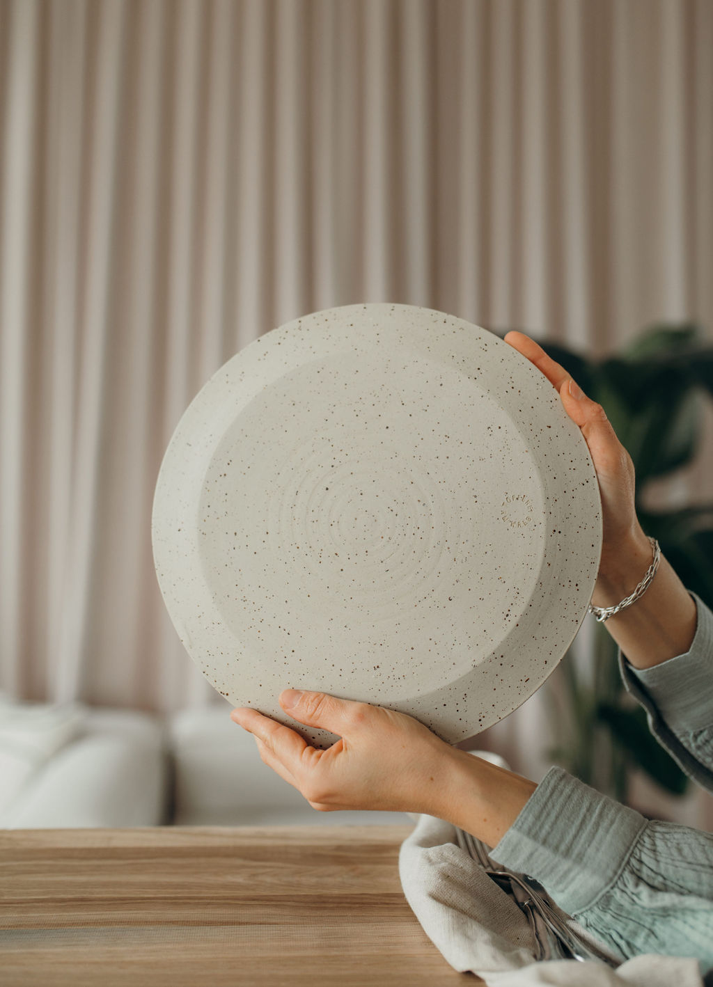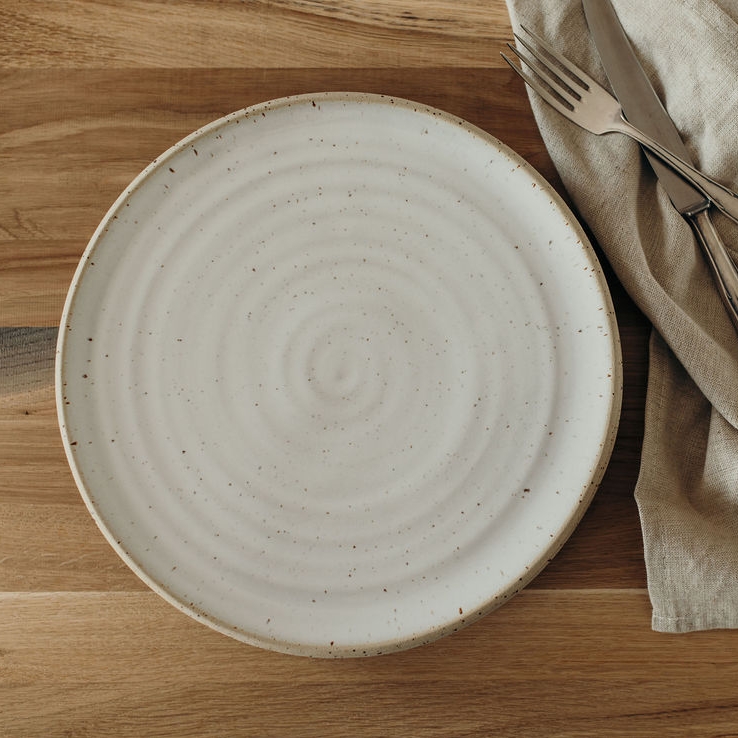 Die weiße, halbtransparente Glasur bildet einen schönen Kontrast zum cremefarbenen Ton mit Sprenkeln. Die Drehspuren sind durch die Glasur sichtbar und unterstreichen den Manufaktur-Charakter. Der Teller ist gut stapelbar. Die unglasierte Unterseite zeigt die pure, natürliche Schönheit des Tons.