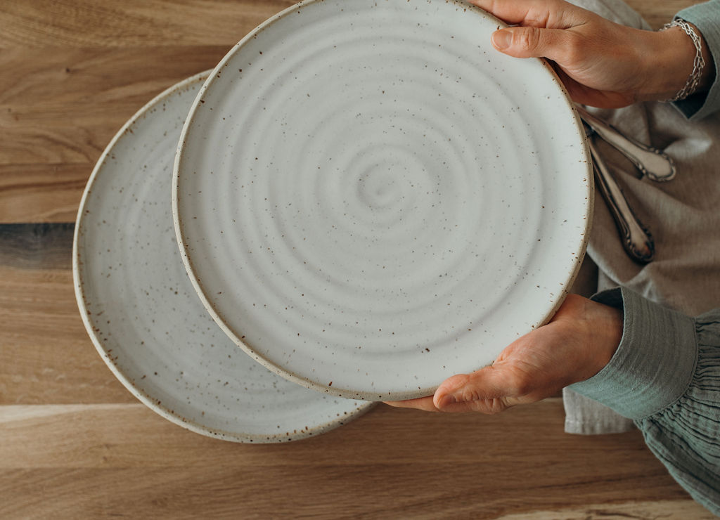 Jeder Teller wird in unserer Töpferei am Wald in liebevoller Handarbeit auf der Töpferscheibe geformt. Leichte Maßabweichungen sind ein Zeichen dieser Handwerkskunst.